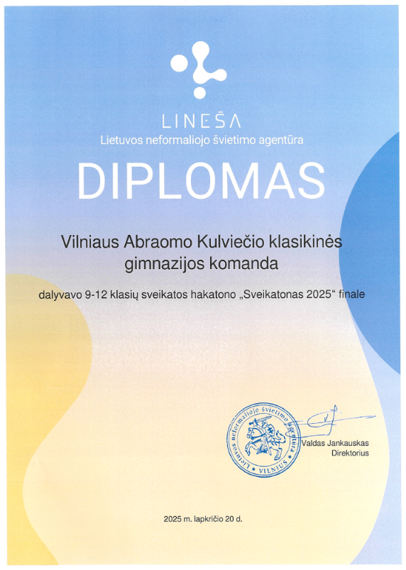 Lapkričio 20 dieną gimnazijos Mokinių tarybos komanda sėkmingai dalyvavo hakatono finale. Į finalą buvo atrinktos tik 13 komandų iš visos Lietuvos, o jos pristatė savo projektus tema „Aš valdau stresą, o ne stresas mane“