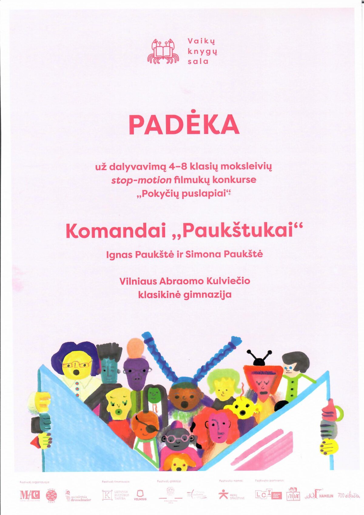 Džiaugiamės, kad tarp dešimties geriausių stop-motion filmų pateko ir mūsų gimnazijos mokinių – Simonos Paukštės (4AD) ir Igno Paukštės (7A) – filmukas „Paskutinės akmenėlių šiukšlės“. Filmuke pagrindiniai veikėjai suprato, kad mesti šiukšles į jūrą yra blogai. Jie pasižadėjo nuo šiol nebešiukšlinti ir saugoti gamtą. Mokiniai tikisi, kad žmonės, pažiūrėję šį filmuką, irgi labiau pradės rūpintis gamta.