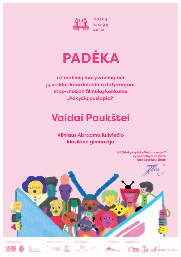 Š. m. lapkričio 22 d. festivalyje „Vaikų knygų sala 2025“ vyko stop-motion animacinių filmų konkurso „Pokyčių puslapiai“ apdovanojimai. 4–8 klasių mokiniai buvo kviečiami sukurti iki 2 minučių trukmės stop-motion animaciją apie pokyčius – klimato kaitą, emocinę sveikatą, technologijų poveikį ar kitus jiems svarbius pasaulio virsmus.