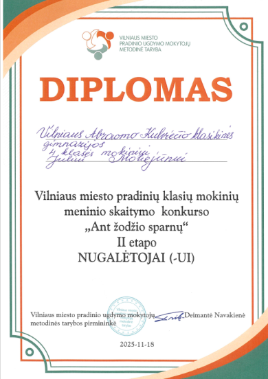 Lapkričio 10 d. mūsų gimnazijoje vyko 3-4 klasių mokinių meninio skaitymo konkursas „Ant žodžio sparnų“. Pirmos vietos nugalėtoju tapo 4c klasės mokinys Julius Motiejūnas. Jis deklamavo Indrės Pliuškytės- Zalieckienės eilėraštį „Kaip mama vežė mane į mokyklą ir bandė aplenkti spūstį“.