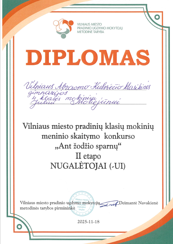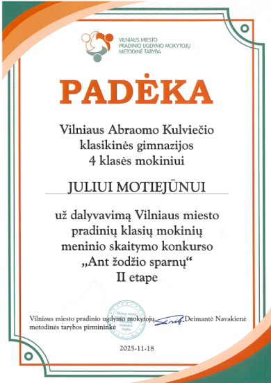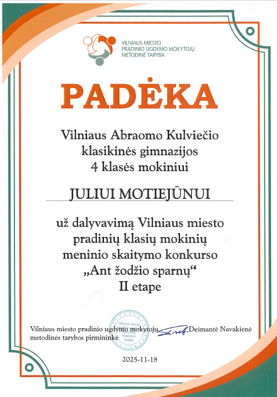 Lapkričio 18 d. Julius Motiejūnas dalyvavo pradinių klasių mokinių II etapo meninio skaitymo konkurse „Ant žodžio sparnų“, kuris vyko Vilniaus „Pelėdos“ pradinėje mokykloje. Julius Motiejus tapo konkurso II etapo nugalėtoju.