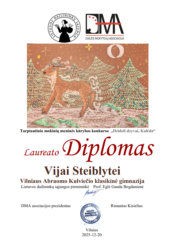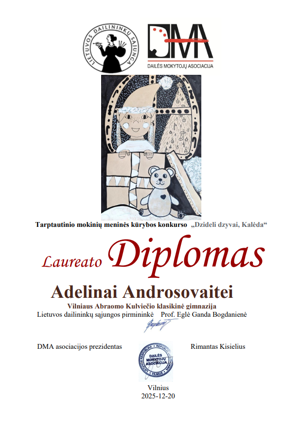 Vilniaus Abraomo Kulviečio gimnaziją atstovavo aštuoni gimnazijos mokiniai iš 5-ų ir 6-ų klasių. Didžiuojamės, kad Vilniaus Abraomo Kulviečio gimnazijos mokinės šiame konkurse suspindo – tapo laureatėmis – Adelina Androsovaitė, 5 al klasė, Vija Steiblytė, 6 al klasė. Mokines konkursui paruošė vyresnioji dailės mokytoja Vilma Kaplanovskienė.