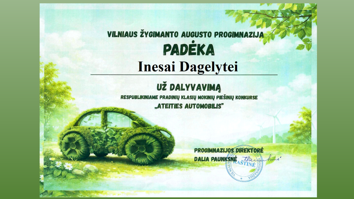 Džiaugiamės, 2ad klasės mokinė Inesa Dagelytė pelnė I vietą respublikiniame 1-4 klasių mokinių piešinių kūrybiniame konkurse ,,Ateities automobilis".