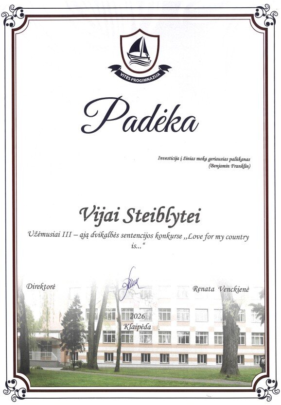 Didžiuojamės, mūsų mokine Vija Steiblyte (6AL klasė) respublikiniame kūrybiniame konkurse pelnė III-ąją vietą!