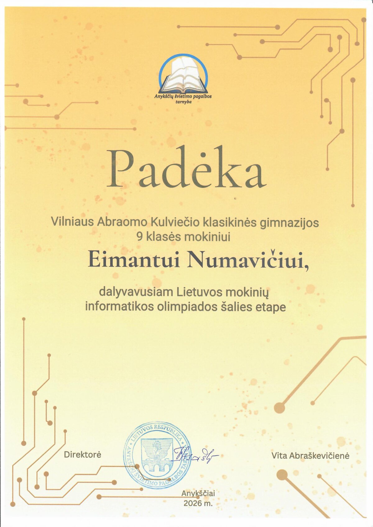Eimantą dalyvauti informatikos olimpiadose paskatino informatikos vyresnioji mokytoja R. Urbonienė