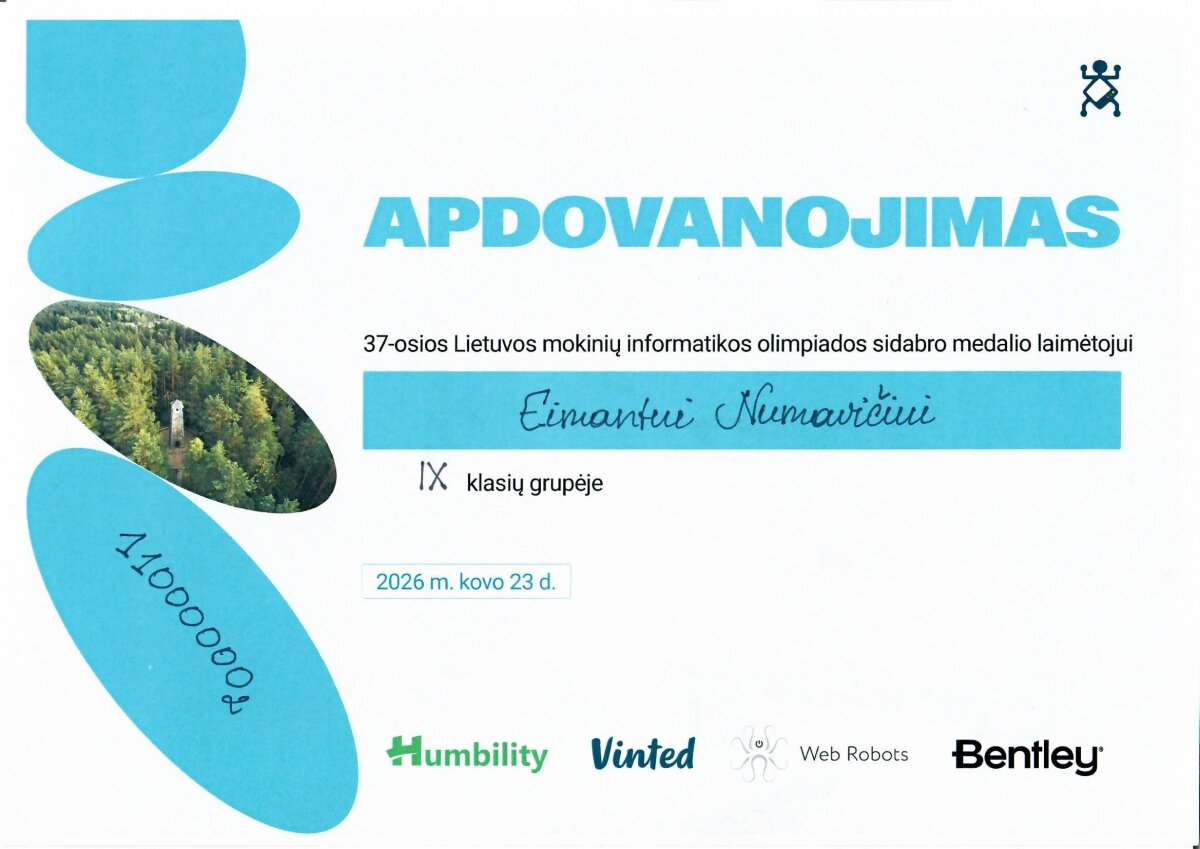 Didžiuojamės mūsų gimnazijos Ia gimn. kl. mokinio Eimanto Numavičiaus laimėtu sidabro medaliu ir užimta antra vieta! Linkime sėkmės ateinančiose olimpiadose!