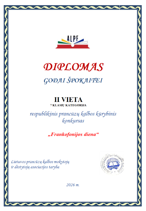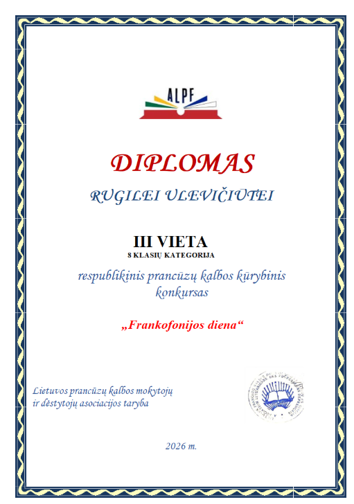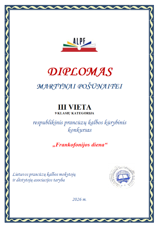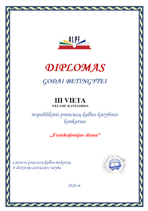 Kovas yra ypatingas mėnuo kiekvienam prancūziškai kalbančiam žmogui, nes tai – frankofonijos mėnuo, o kovo 20 d. yra oficialiai paskelbta pasauline frankofonijos diena. Šiemet šia proga Lietuvos mokytojų ir dėstytojų asociacija pirmą kartą šalies mastu surengė piešinių konkursą frankofonijos tema. Mokiniai galėjo išreikšti savąją frankofonijos viziją piešiniais. Buvo pateikta apie 200 darbų iš visos šalies mokyklų. Mūsų gimnazijos mokiniams šis konkursas buvo labai sėkmingas: 7c kl. mokinė Goda Špokaitė užėmė II vietą 7klassių kategorijoje, 8b kl. mokinės Goda Betingytė ir Rugilė Ulevičiūtė – III vietą 8 klasių kategorijoje, IA gimnazijos klasės mokinė Martyna Pošiūnaitė – III vietą I klasių kategorijoje.
