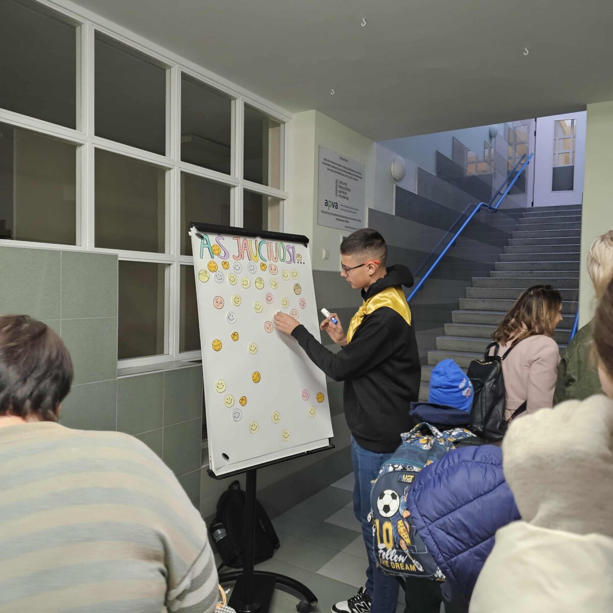 Spalio 2 d. mūsų gimnazijoje prieš pirmą pamoką visi bendruomenės nariai – mokiniai, mokytojai ir tėveliai – turėjo galimybę „pasimatuoti“ savo nuotaiką.