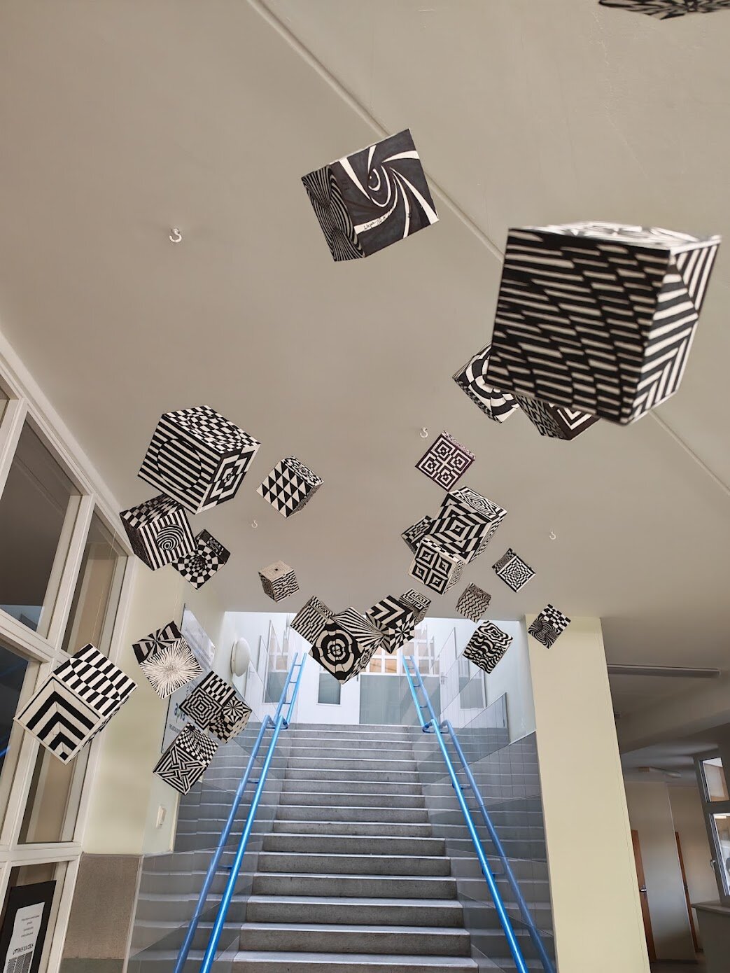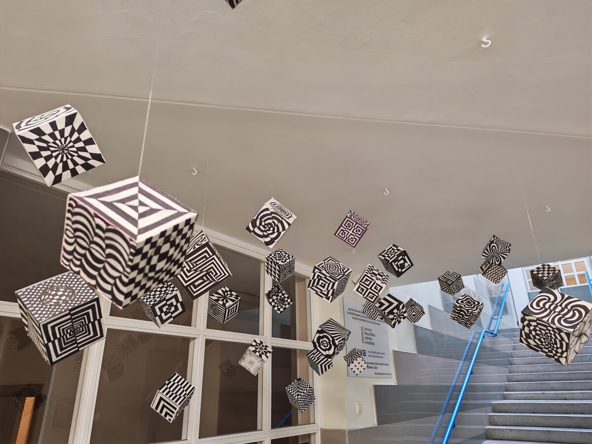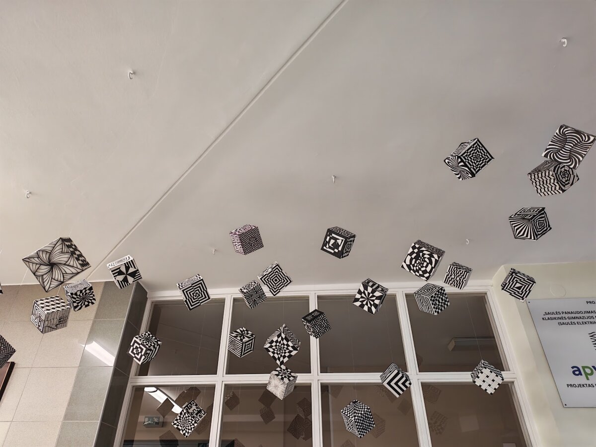 Dailės pamokų metu kartu su II gimnazijinių klasių moksleiviais išsiaiškinome kokie yra optinių iliuzijų geometriniai pagrindai. Mokiniai sužinojo kaip panaudojant geometrines formas ir kontrastus galima sukurti judėjimo ir gylio iliuzijas. Nagrinėjome M. C. Escher, V. Vasarely, B. Riley, S. Dali bei K. Varnelio darbus, kurie yra puikūs pavyzdžiai, kaip geometrijos principai gali būti panaudoti kuriant neįmanomas struktūras ir erdves. Mokiniai pasitelkę žinias apie kontrasto ir spalvų teoriją bei šviesos ir šešėlių panaudojimą, pasirinkę grafinę raišką kūrė savitas optinių iliuzijų kompozicijas.