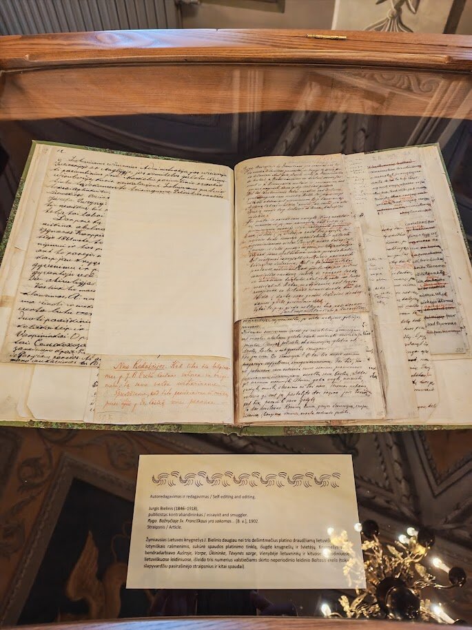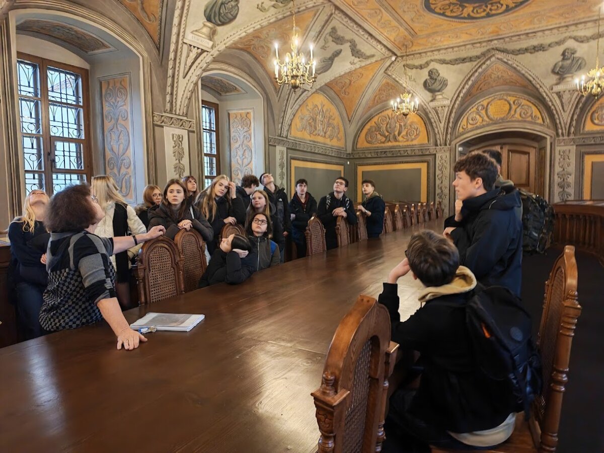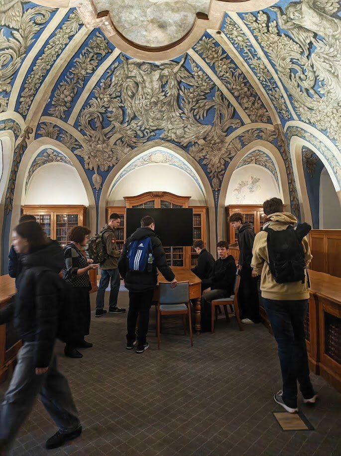 Spalio 31 dieną I d gimnazijos klasės mokiniai lankėsi VU bibliotekoje, kuri įkurta 1570 m., iki šių dienų išliko autentiškose erdvėse. Kartu su visais senojo universiteto pastatais ir kiemeliais ji sudaro vieningą, įspūdingą ir nepakartojamą Vilniaus senamiesčio architektūrinį ansamblį, reprezentuojantį Lietuvos mokslo ir kultūros pažangos istoriją. Ekskursijos metu aplankėme bibliotekos ir universiteto sales: Pranciškaus Smuglevičiaus ir Joachimo Lelevelio Baltąją observatoriją. Pranciškaus Smuglevičiaus salėje gimnazistai išvydo žymių rašytojų rankraščių parodą „Taisanti ranka“, kurioje eksponuojami iškilių Lietuvos istorijos ir kultūros asmenybių – Simono Daukanto, Motiejaus Valančiaus, Jono Basanavičiaus, Vinco Kudirkos, Maironio, Kazio Griniaus, Juozo Tumo-Vaižganto, Kazimiero Būgos, Mikalojaus Konstantino Čiurlionio, Kazio Binkio, Alfonso Nykos-Niliūno ir kitų – autografus, žymių kūrinių – Balio Sruogos „Milžino paunksmė“, Vinco Mykolaičio-Putino „Altorių šešėly“, Antano Škėmos „Balta drobulė“ ir kitus rankraščius.