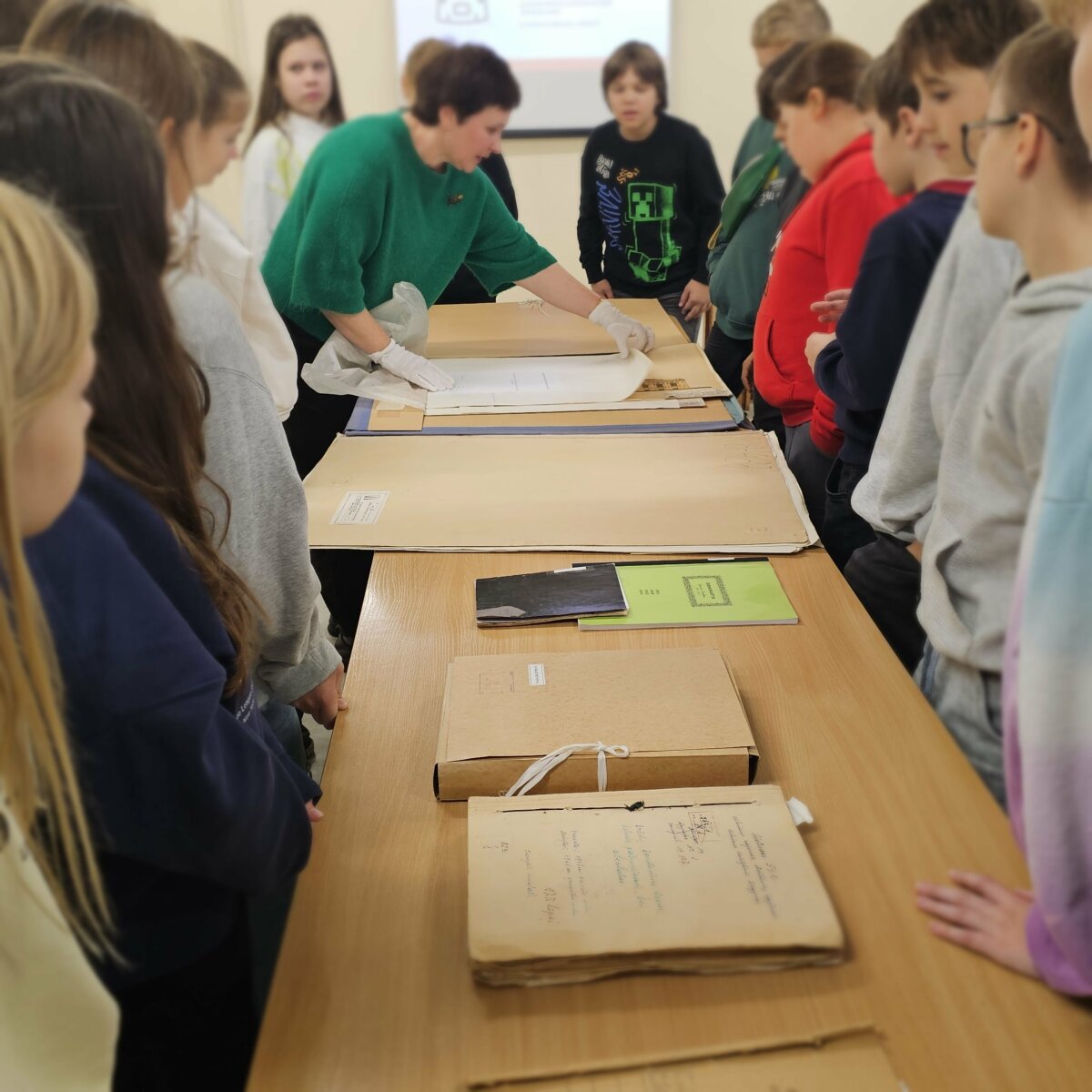 Archyve mokiniai sužinojo, kas yra archyvaras ir kodėl ši profesija yra svarbi visuomenei, kaip archyve saugomi dokumentai, kaip jie atrenkami ir kokios taisyklės padeda juos išsaugoti ateities kartoms.