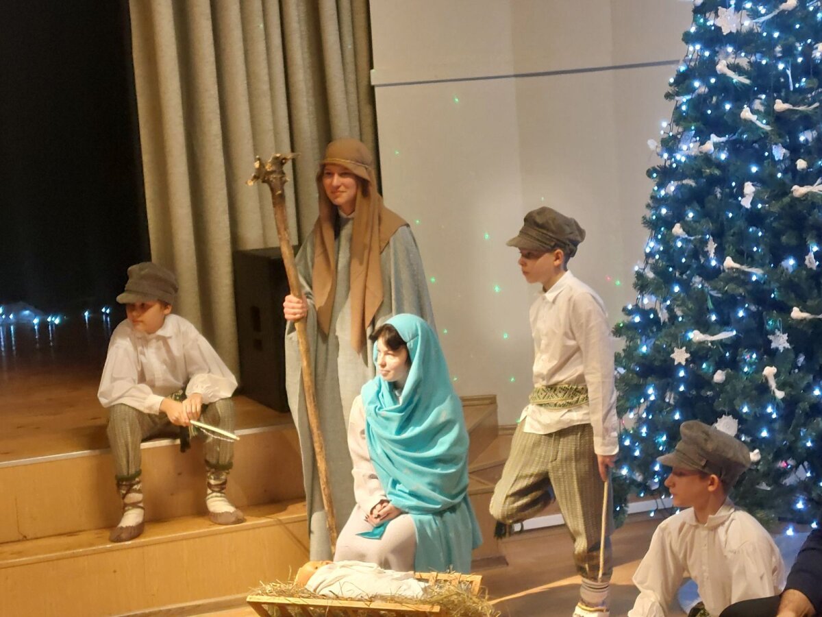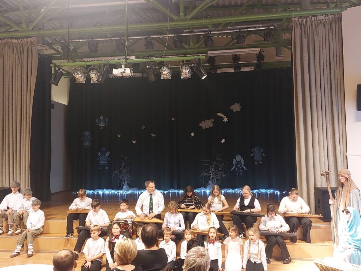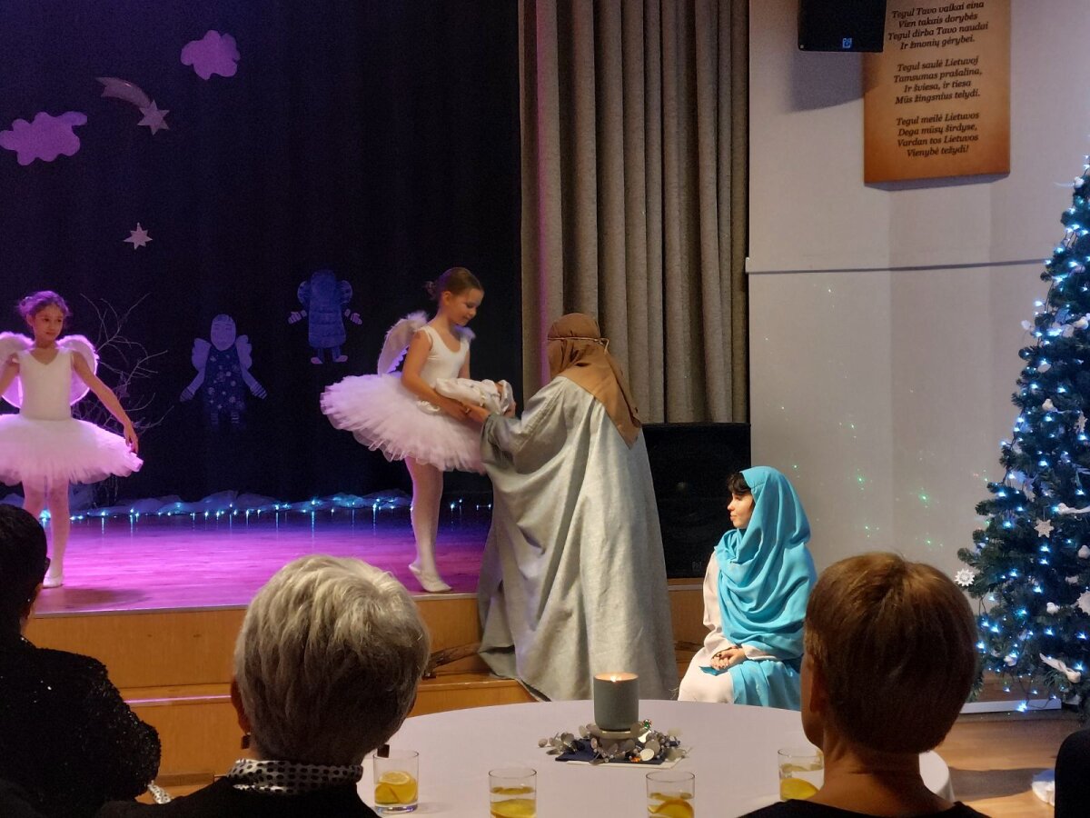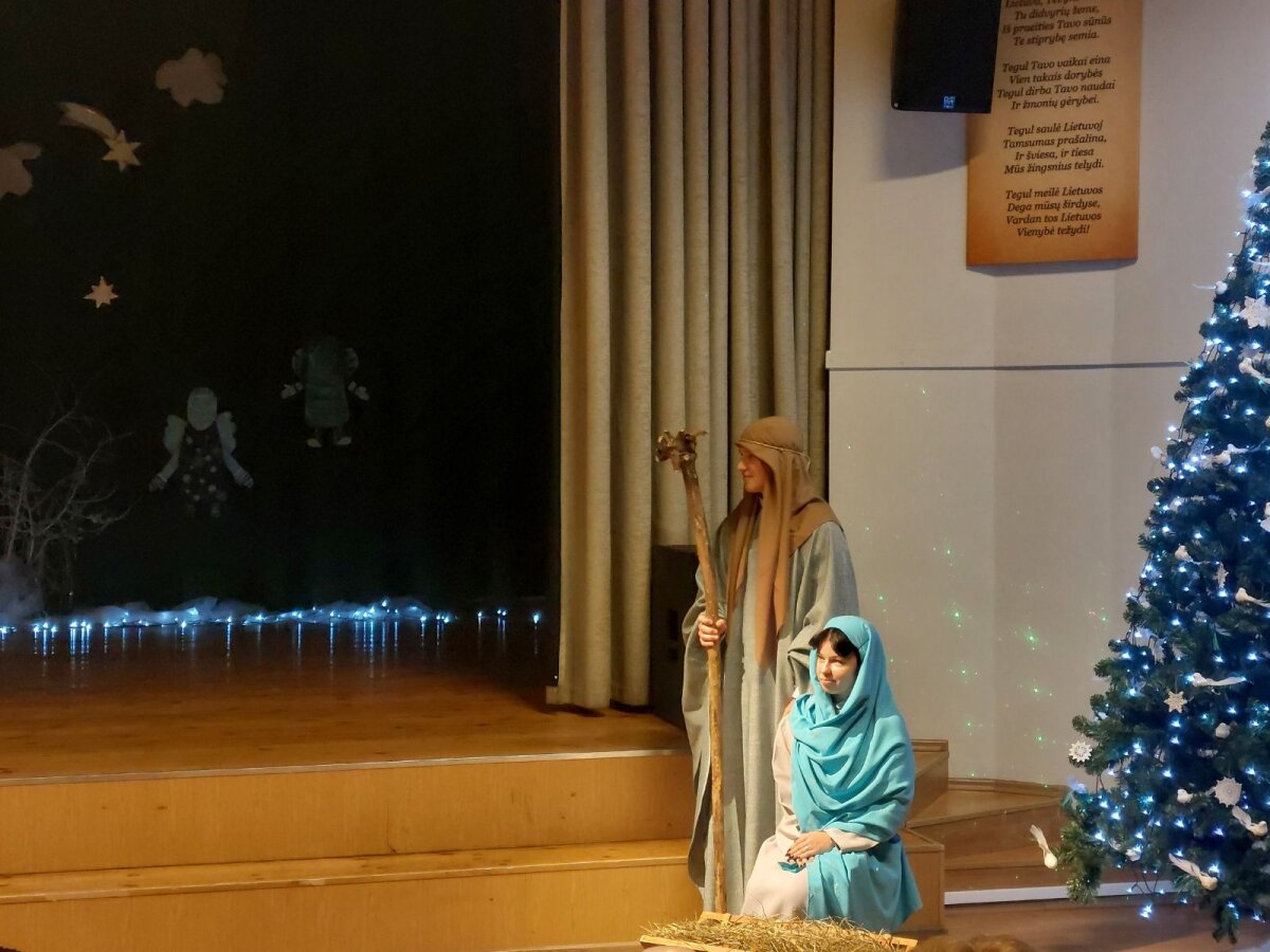Tradicinė Kalėdų misterija gimnazijoje kasmet džiugina originaliomis meninėmis ir režisūrinėmis interpretacijomis. Šiųmetinės pradžią paskelbė dviejų mokytojų pučiamos daudytės ir joms atitariantis grupės berniukų ragų gausmas.