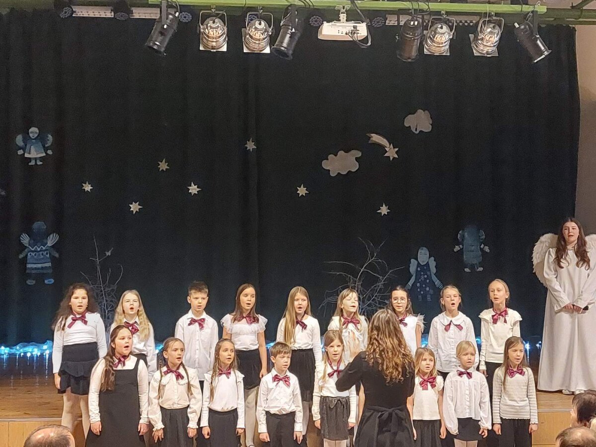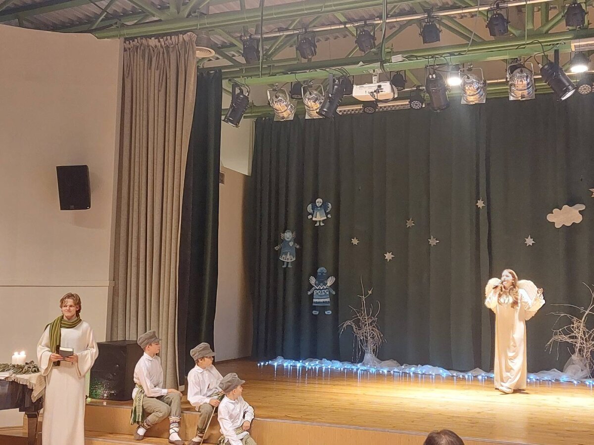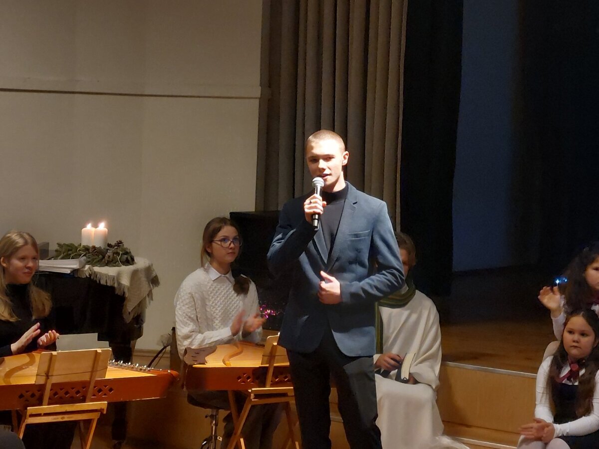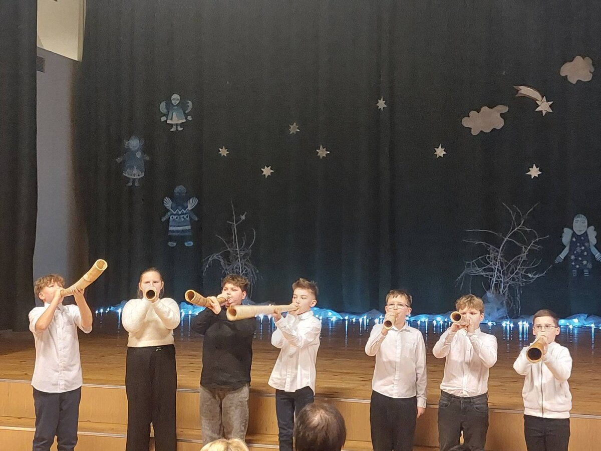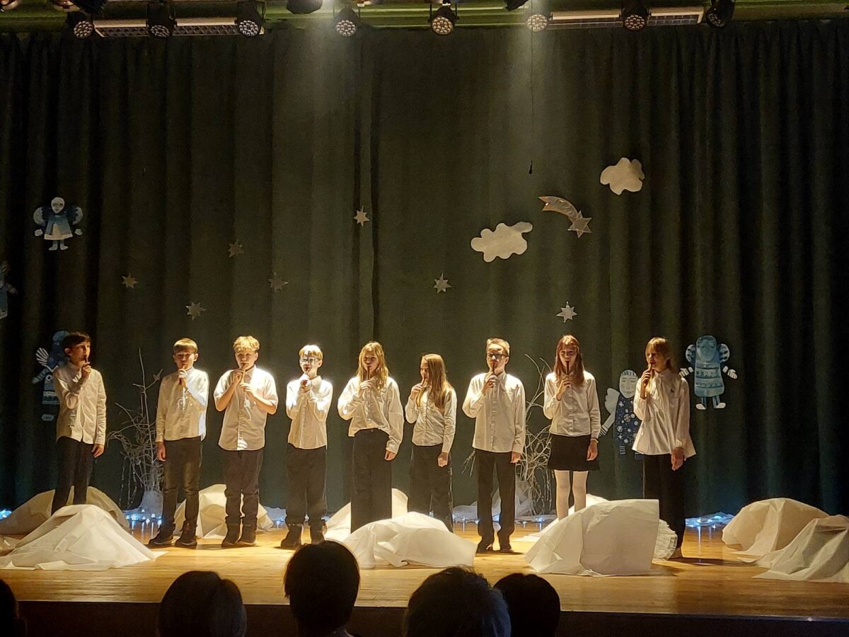Tradicinė Kalėdų misterija gimnazijoje kasmet džiugina originaliomis meninėmis ir režisūrinėmis interpretacijomis. Šiųmetinės pradžią paskelbė dviejų mokytojų pučiamos daudytės ir joms atitariantis grupės berniukų ragų gausmas.