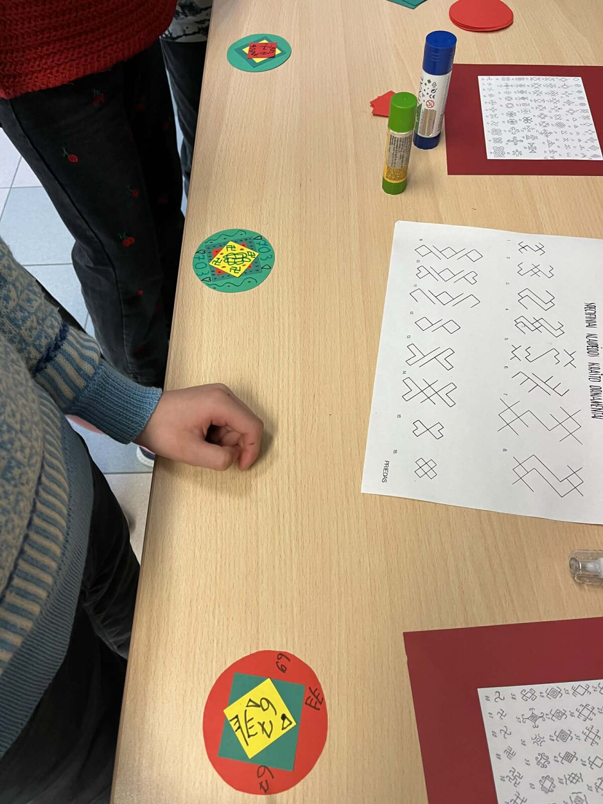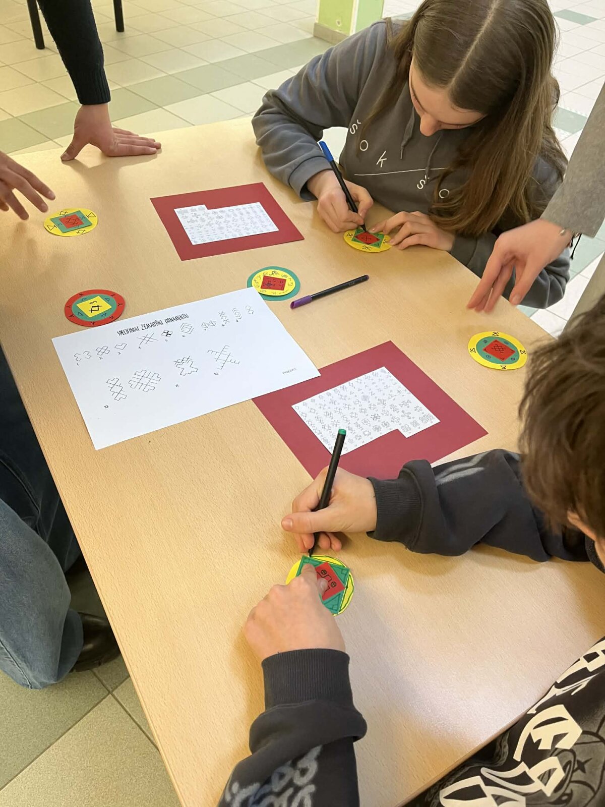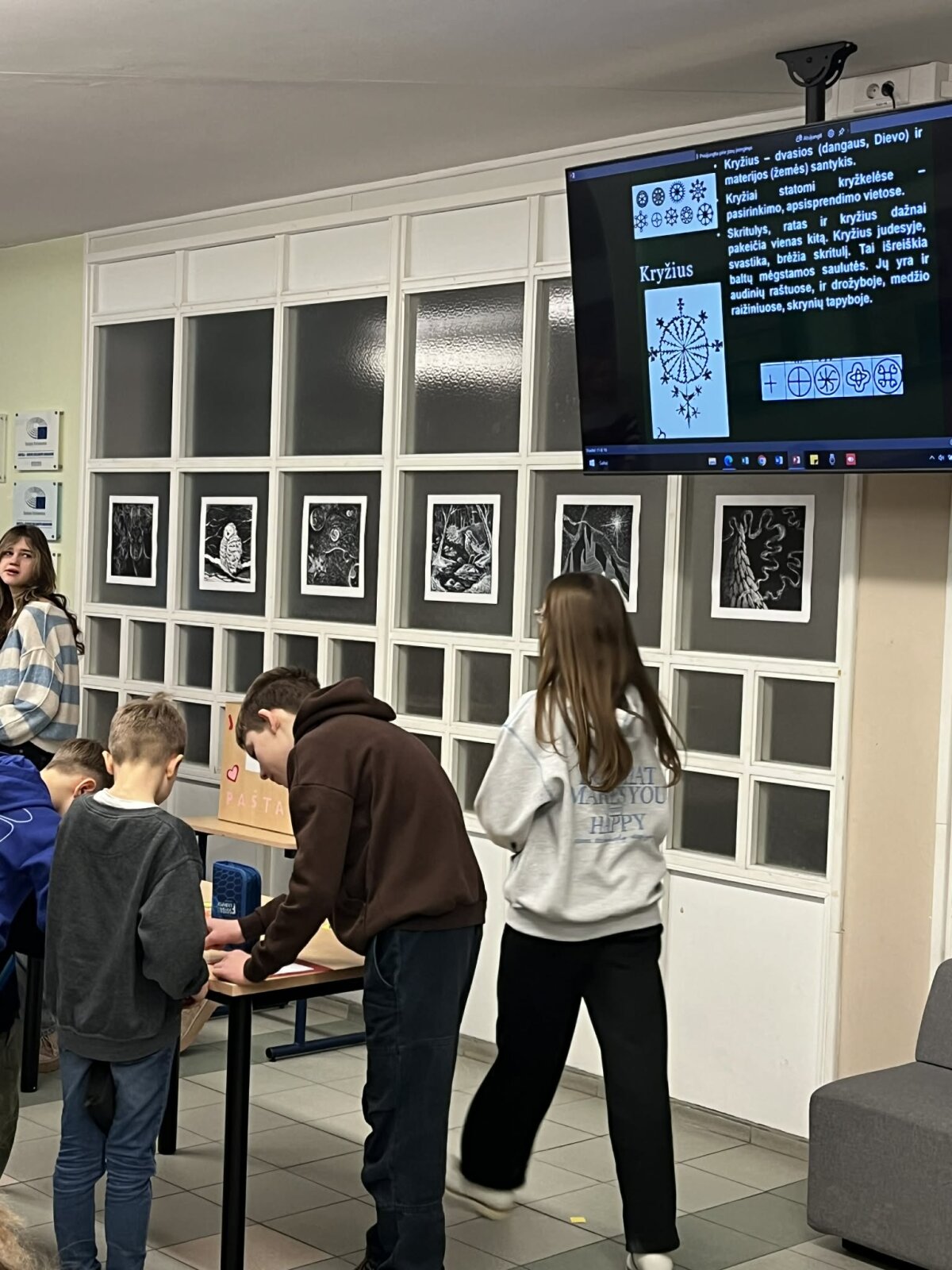 Trečiadienį pirmokai ir antrokai rekreacijoje įrengė kūrybinę tautinės atributikos dirbtuvę ir prisigamino trispalvių medalių, kuriais iš karto ir apsidovanojo, tokiu būdu gyvai papuošdami visą gimnaziją.