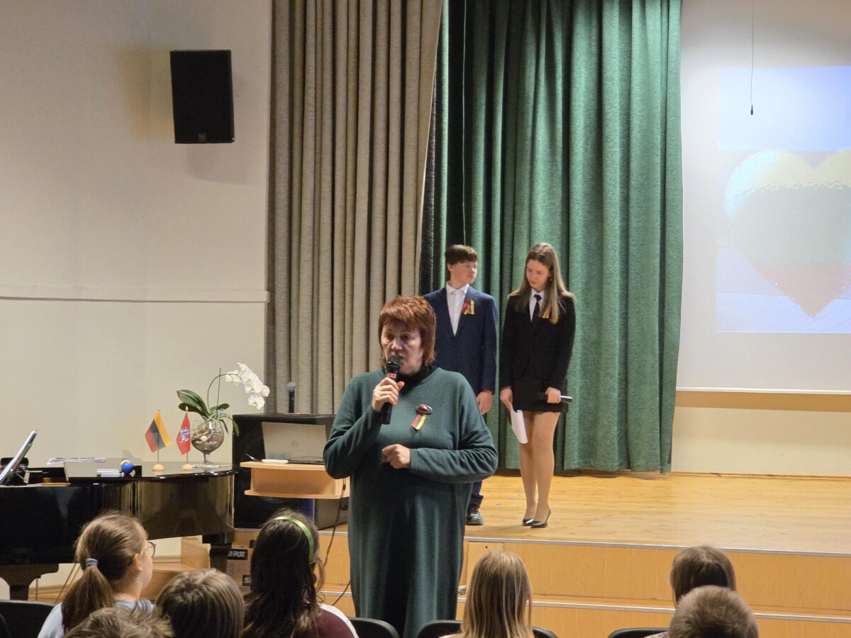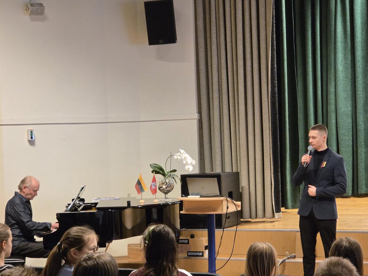 Penktadienį vyresniems mokiniams vyko pilietiškumo pamoka, vedama politiko, gimnazijos garbės piliečio Artūro Paulausko. Lektoriaus įtaiga kelių šimtmečių lietuvių kelią į savo valstybingumą nušvietė ryškia ir jaukia šviesa, sklindančią į šiandieną ir į tolimesnę ateitį. Visų širdis suvirpino ir meninė gimnazistų bei jų mokytojų programa.