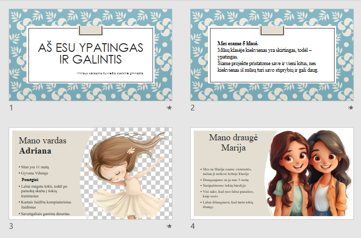 Kovo mėn. gimnazijos 5 klasių mokiniai dalyvavo respublikiniame mokyklų bendruomenių projekte „Aš esu ypatingas ir galintis“, kurio metu įvairiausiais būdais mokiniai demonstravo savo asmenybės unikalumą, talentus, gebėjimus, pomėgius ir galias. Su atrinktais mokinių darbais kviečiame susipažinti gimnazijos bibliotekoje.