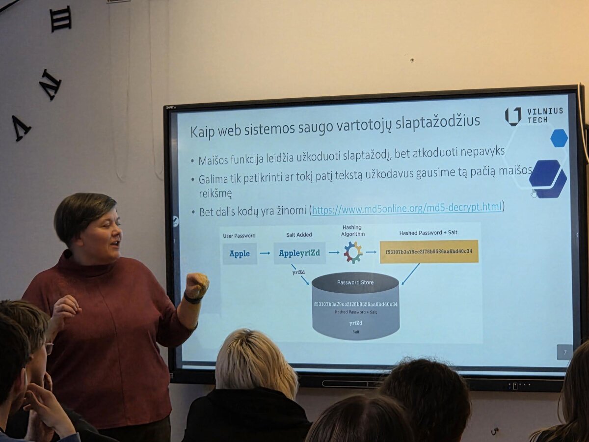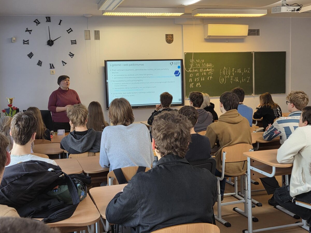 Siekdamos praturtinti informatikos pamokas ir dar labiau sudominti mokinius kibernetinio saugumo tema, gimnazijos informatikos mokytojos Vaida Paukštė ir Roma Urbonienė pakvietė VILNIUS TECH profesorę dr. Simoną Ramanauskaitę, kuri kovo 12 dieną skaitė paskaitą „Kodėl būtinas atsargumas naršant internete? Programišių taikomi metodai“.